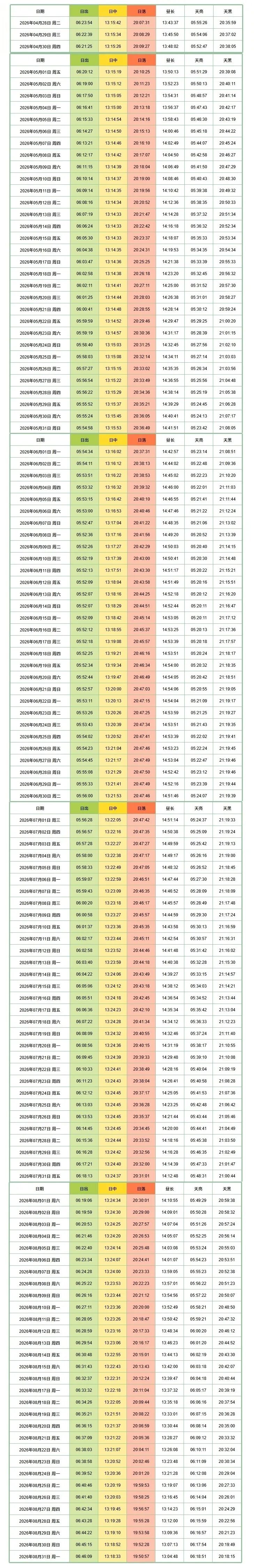 日出日落时刻表