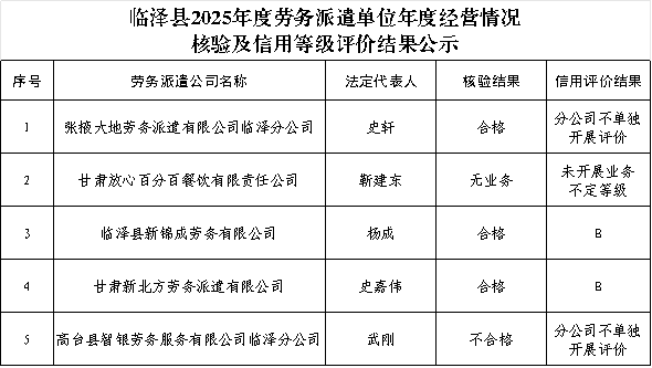 临泽县2025年劳务派遣单位年度经营情况报告核验及信用等级评价结果公示