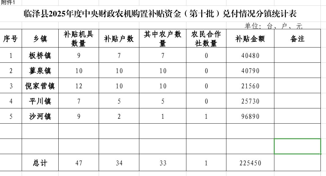 附件:1.临泽县2025年度中央财政农机购置补贴资金(第十批)兑付情况分镇统计表
