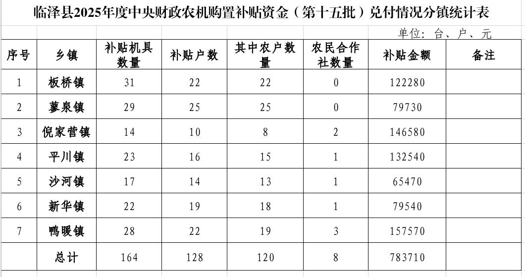 根据《甘肃省财政厅关于提前下达2025年中央财政农业产业发展资金(农机购置与应用补贴)预算的通知》(甘财农〔2024〕90号)、《甘肃省财政厅关于提前下达2025年省级财政农业产业发展资金(农机购置与应用补贴支出)预算的通知》(甘财农〔2024〕109号)和《甘肃省财政厅关于下达2025年中央财政农业产业发展资金(农机购置与应用补贴)的通知》(甘财农〔2025〕32号)及《甘肃省财政厅关于下达2025年省级财政农机购置与应用补贴资金的通知》(甘财农〔2025〕76号)精神,安排我县2025年中央财政和省级财政农机购置与应用补贴资金2087万元。按照县农业农村局、县财政局《关于印发〈临泽县2024-2026年农机购置与应用补贴实施方案〉的通知》(临农发〔2024〕49号)要求,对已经录入《甘肃省农机购置与应用补贴申请办理服务系统 (2021-2026)》,并经县、镇补贴机具核验工作小组核实确认、公示无异议的161份购置补贴对应的164台购置补贴机具的购机者兑付补贴资金78.371万元。(详情见附件)