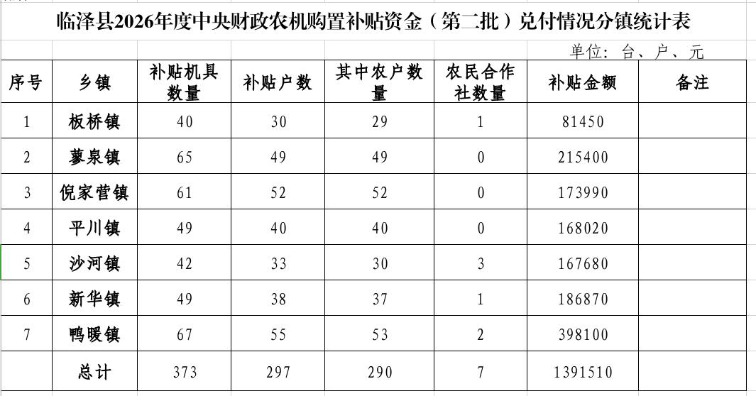 附件:临泽县2026年度中央财政农机购置补贴资金(第二批)兑付情况分镇统计表