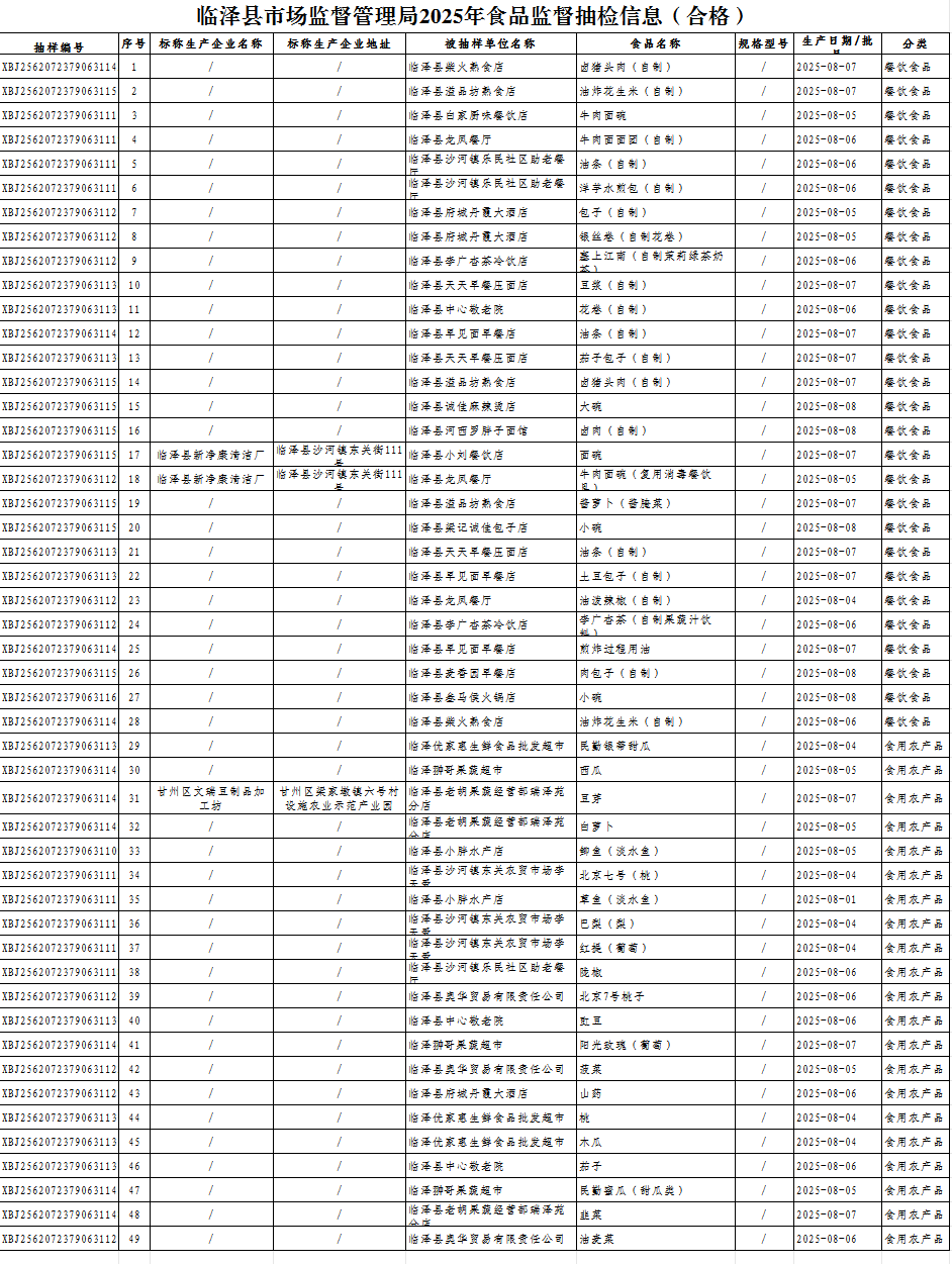 附件:临泽县市场监督管理局食品监督抽检信息(合格)