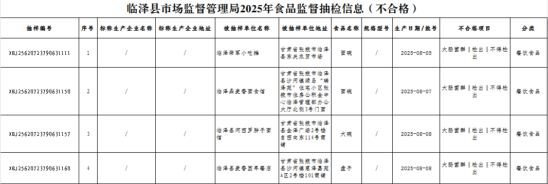 临泽县市场监督管理局食品监督抽检信息(不合格)