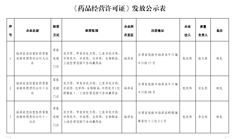 根据《中华人民共和国药品管理法》《中华人民共和国药品管理法实施条例》及《药品经营和使用质量监督管理办法》的有关规定,经我局依照《张掖市药品经营许可证(零售)审批程序规定》组织现场检查,以下药店符合《药品经营质量管理规范现场检查指导原则》《甘肃省药品零售企业验收实施标准》开办设立的规定条件现予以公示(公示时间:20261月27日—2026年12月29日),请社会各界监督。