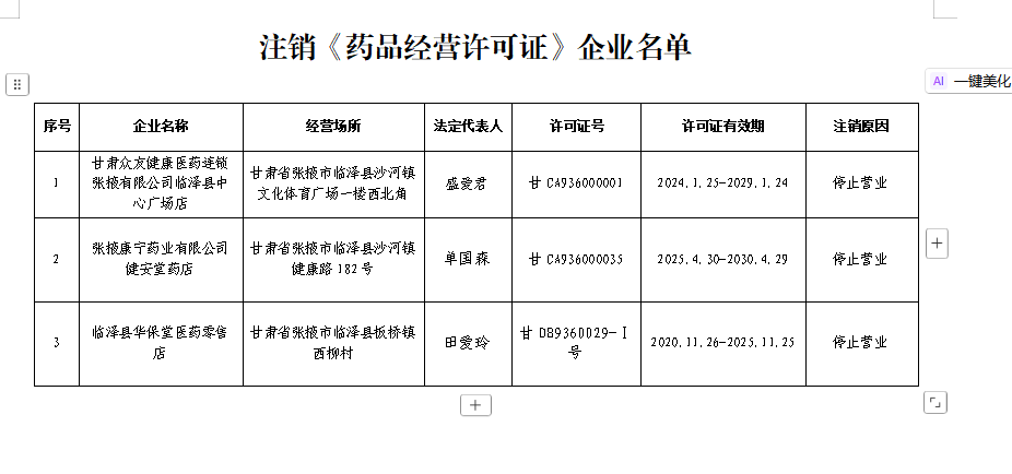 根据《中华人民共和国行政许可法》《药品经营和使用质量监督管理办法》等规定,经持证企业申请,我局同意注销甘肃众友健康医药连锁张掖有限公司临泽县中心广场店、张掖康宁药业有限公司健安堂药店、临泽县华保堂医药零售店3家企业的《药品经营许可证》。自注销之日起,企业应依法停止药品经营活动,请社会各界监督。