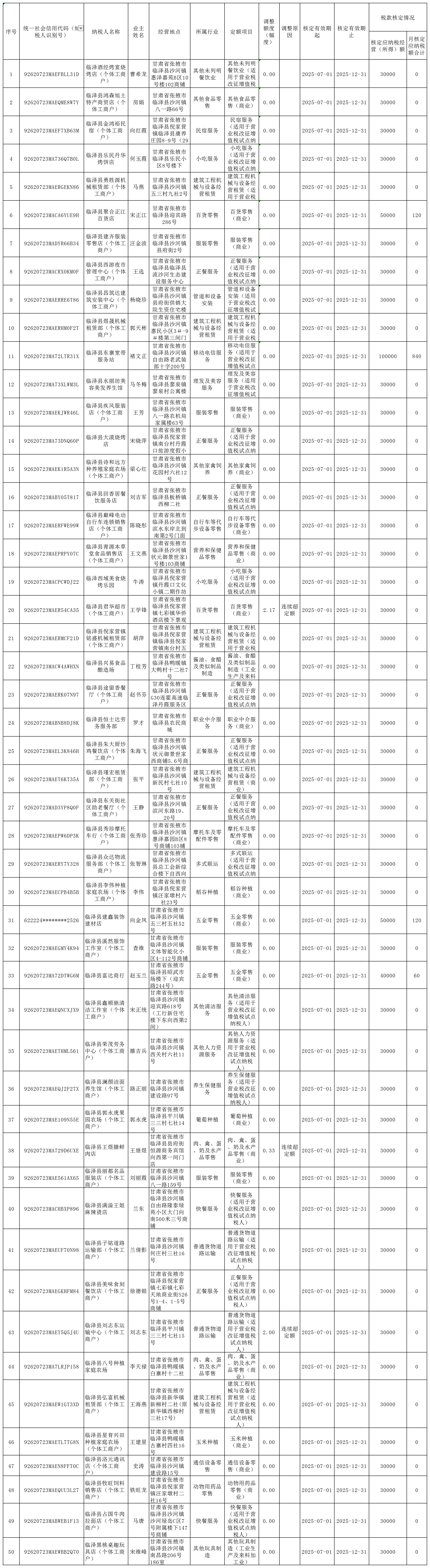国家税务总局临泽县税务局定期定额核定公示(2025年8月)