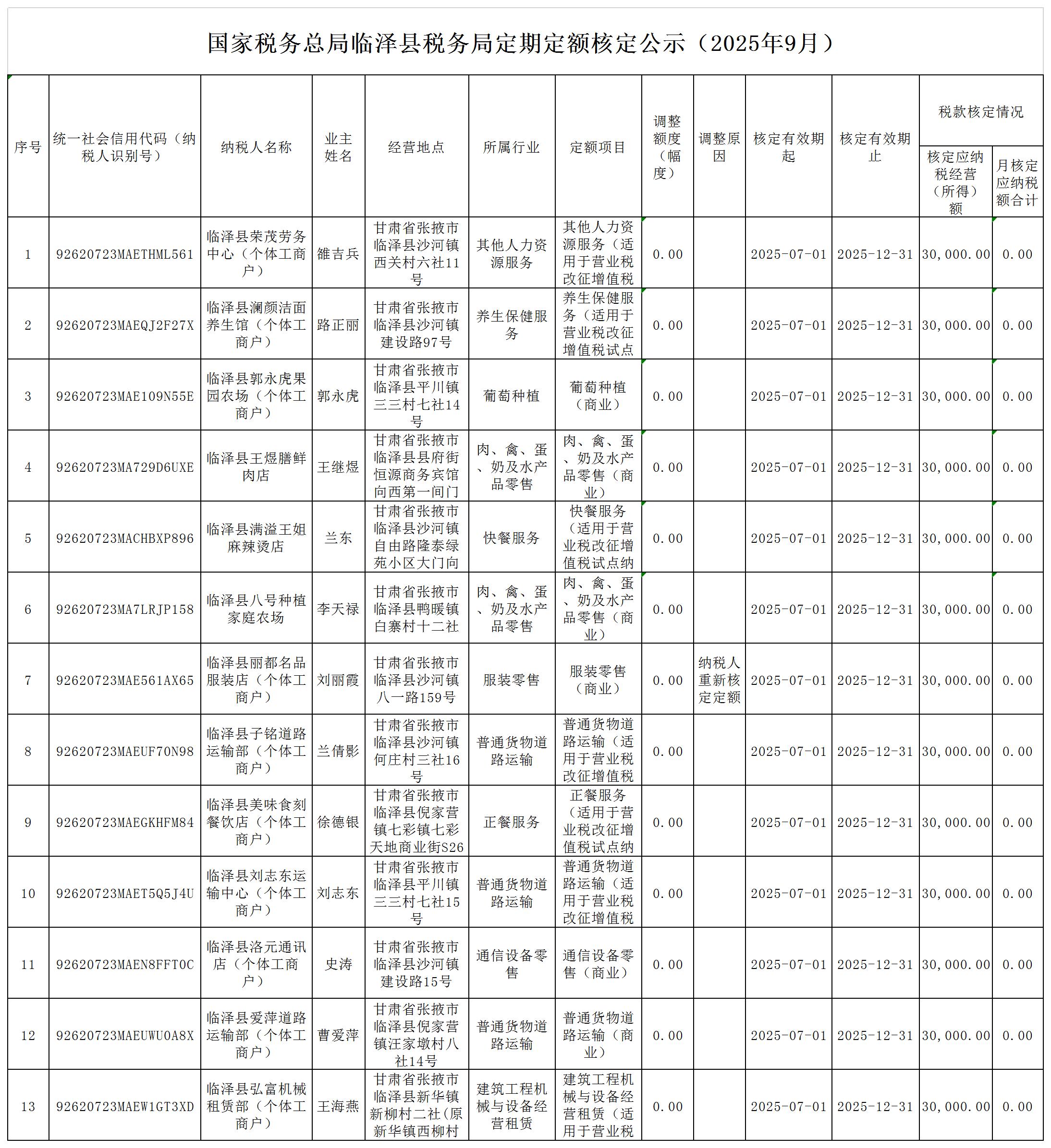 国家税务总局临泽县税务局定期定额核定公示(2025年9月)