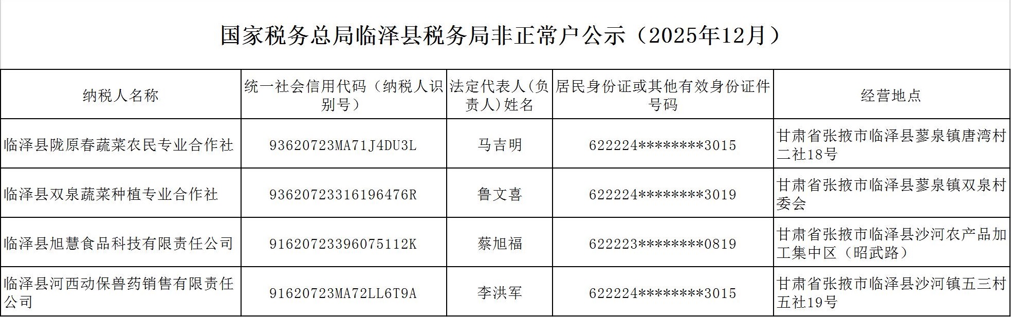 国家税务总局临泽县税务局非正常户公示(2025年12月)