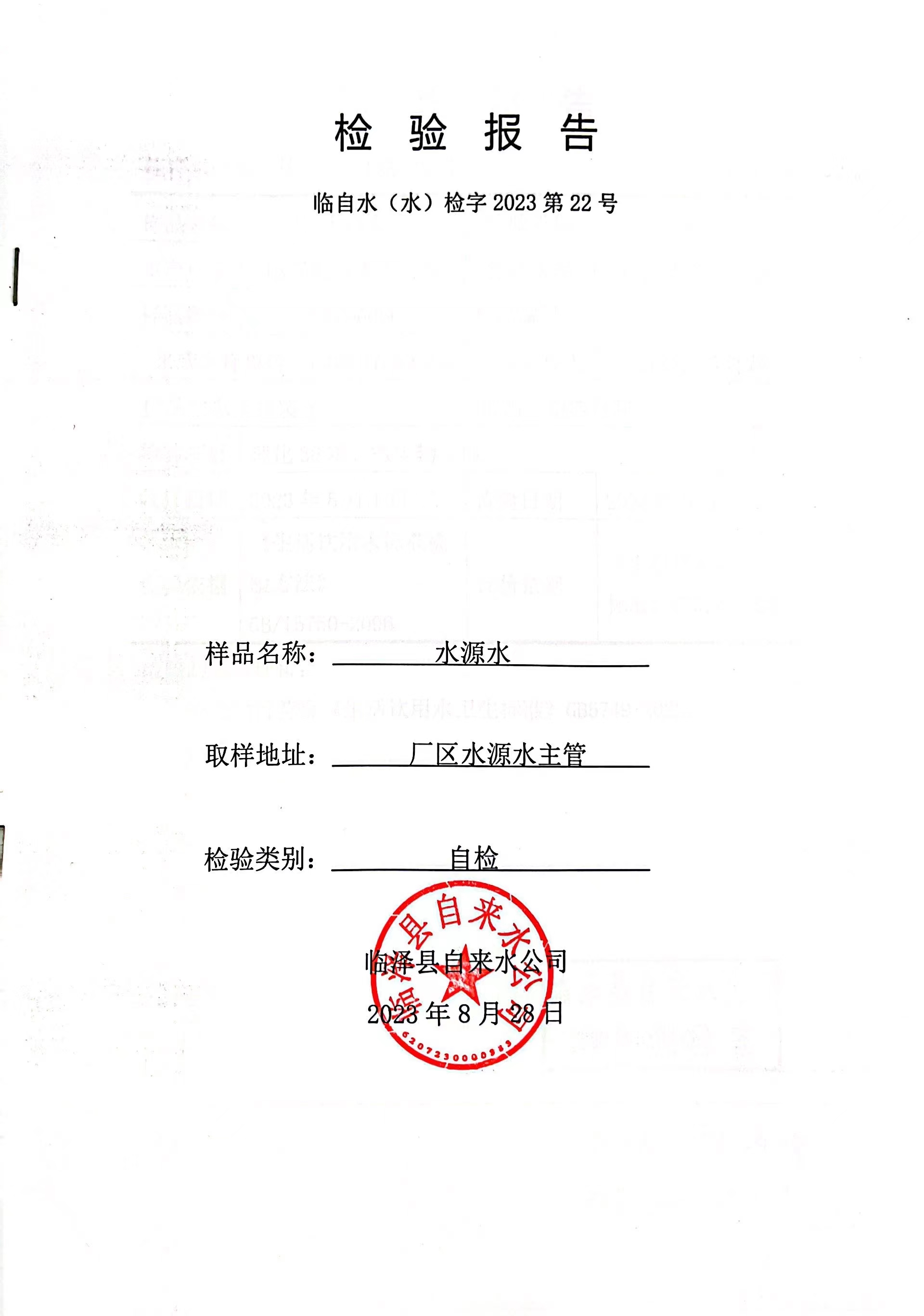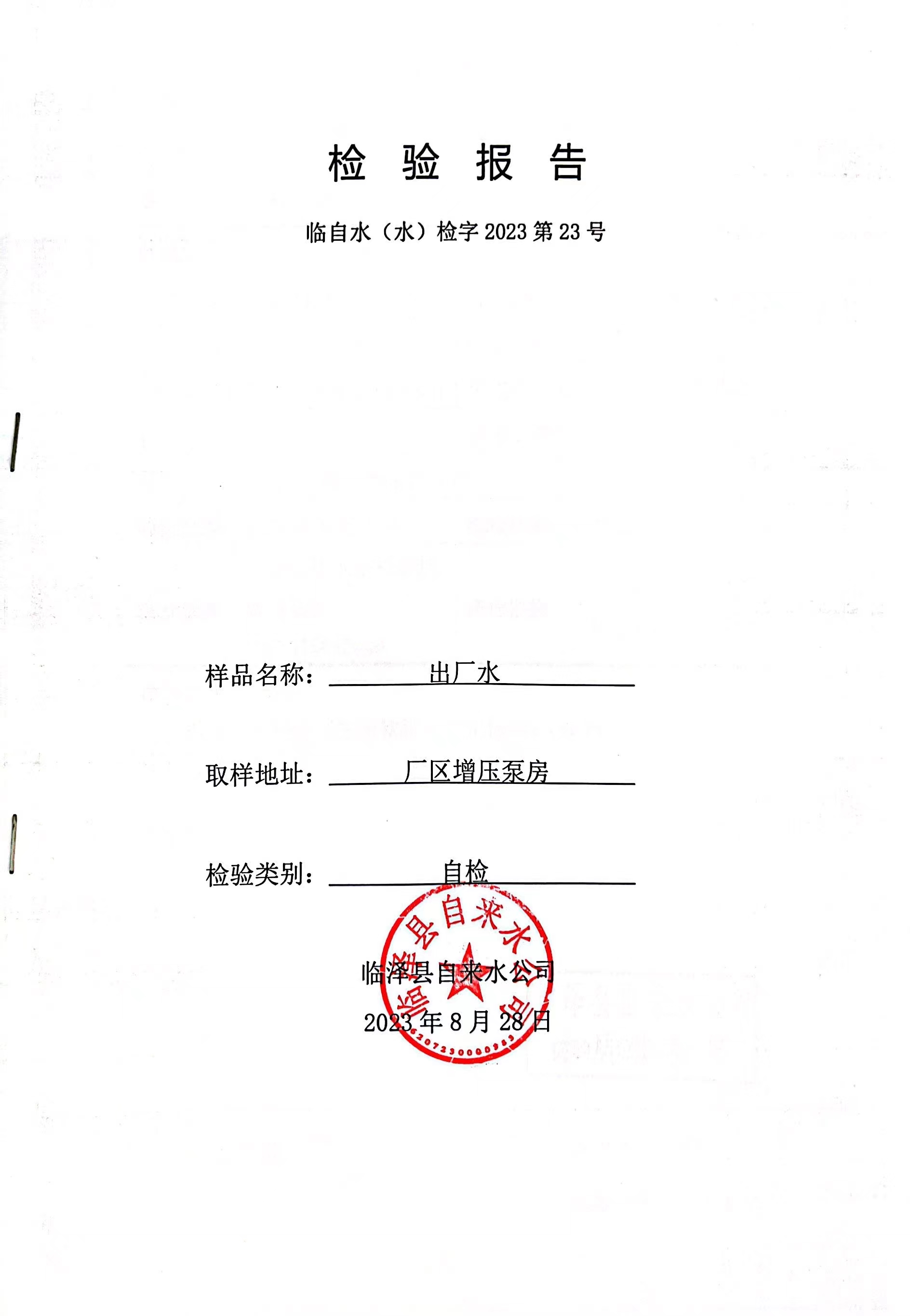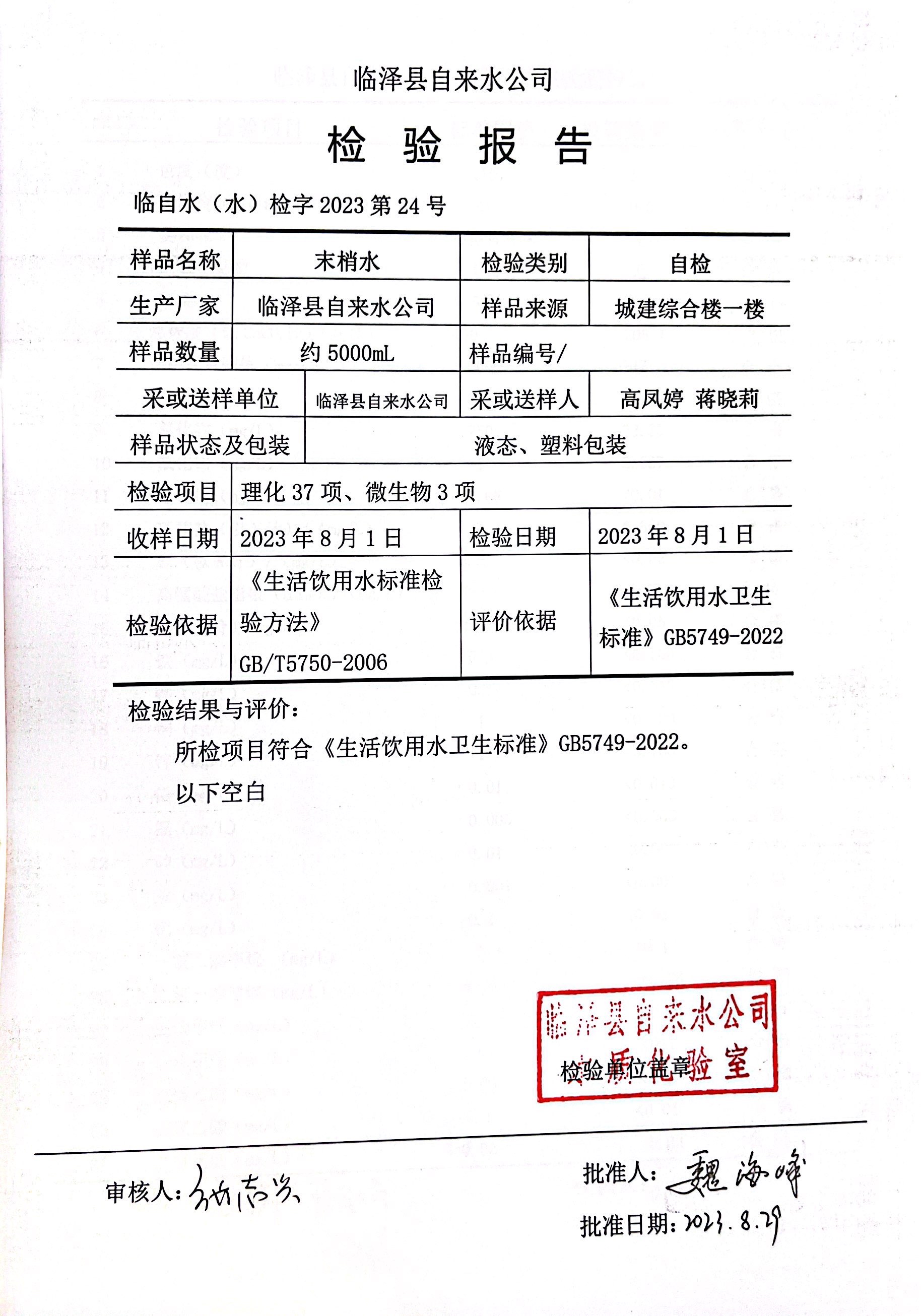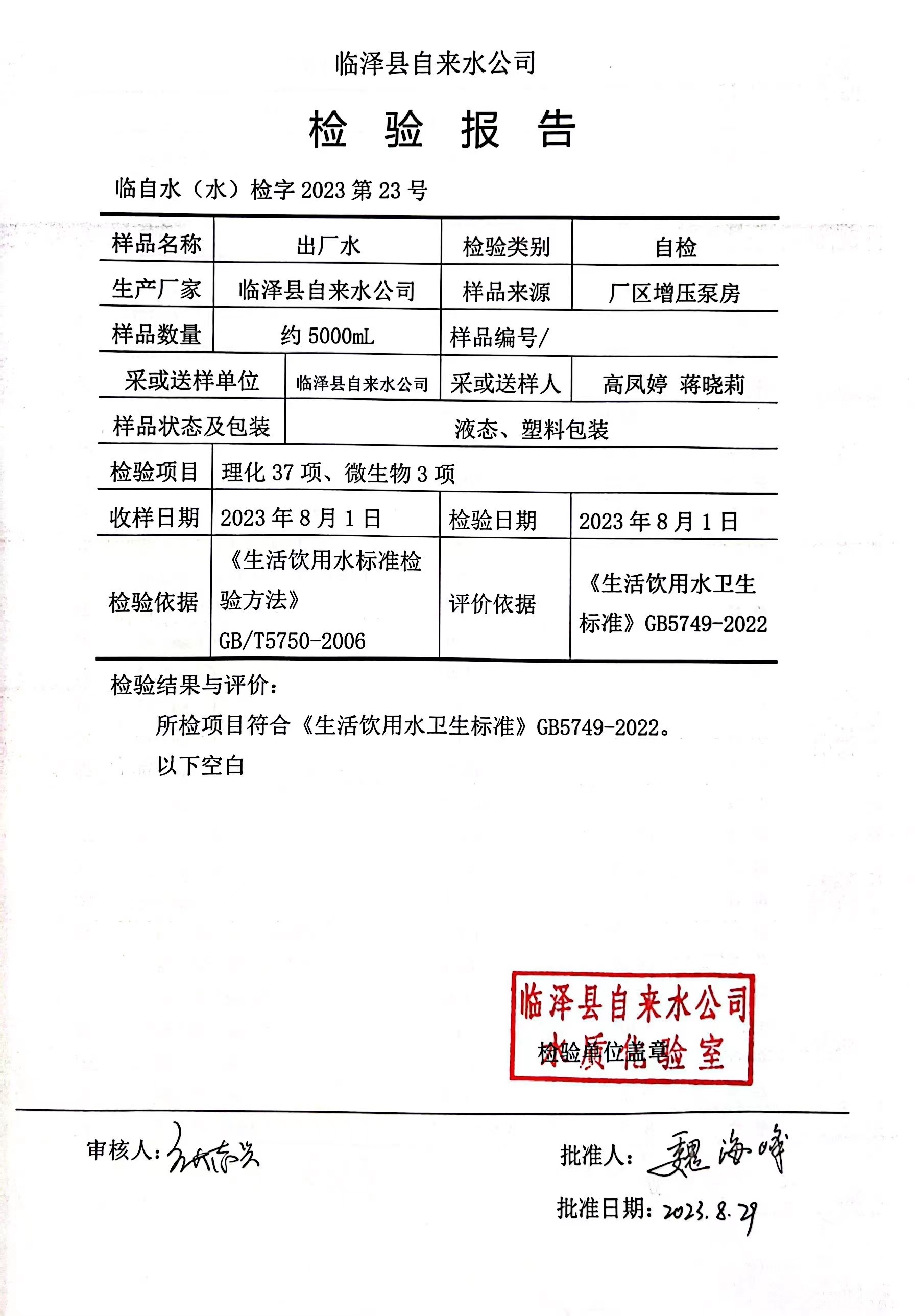 2023年8月临泽城市供水生活饮用水水质检测结果