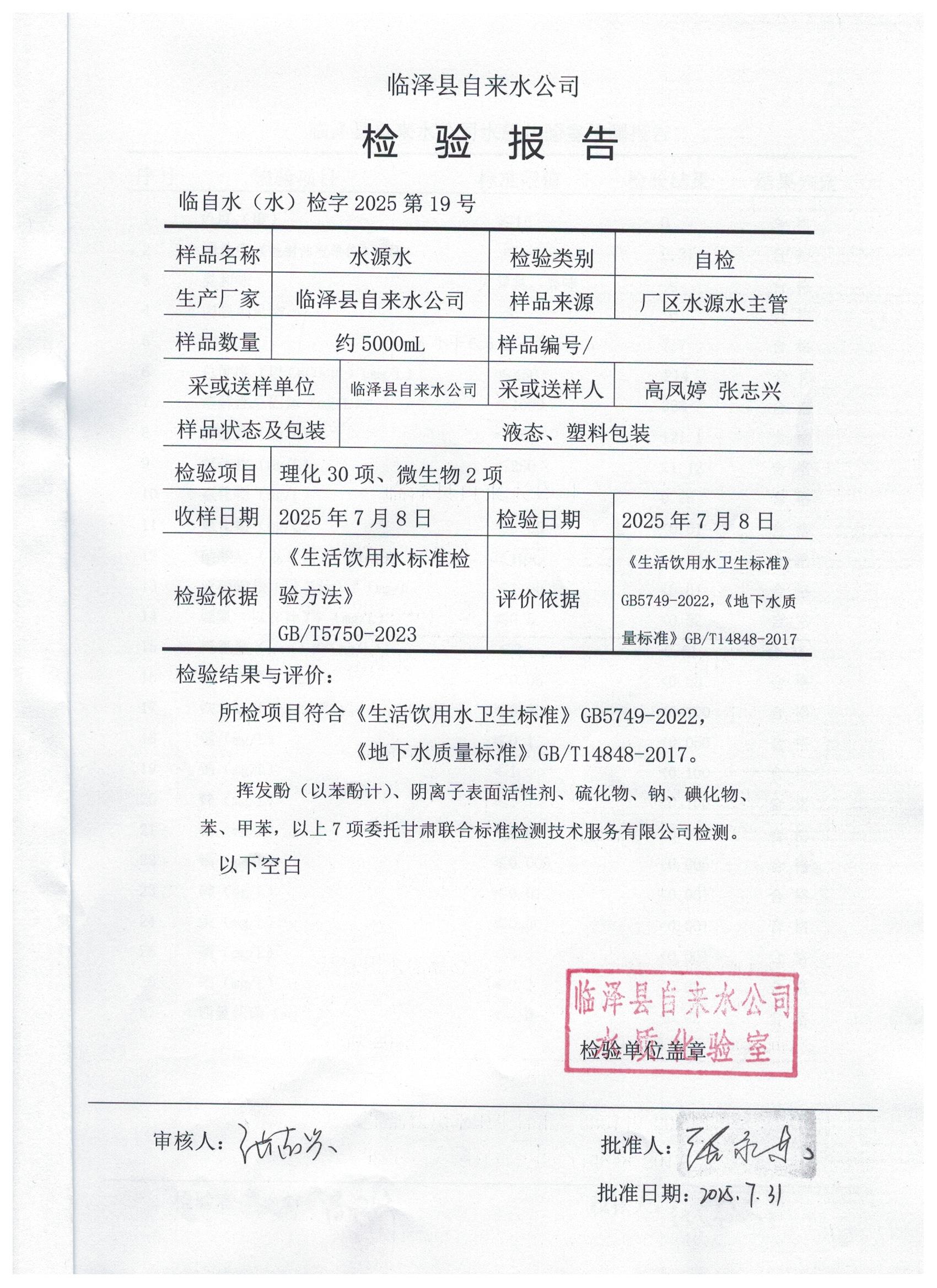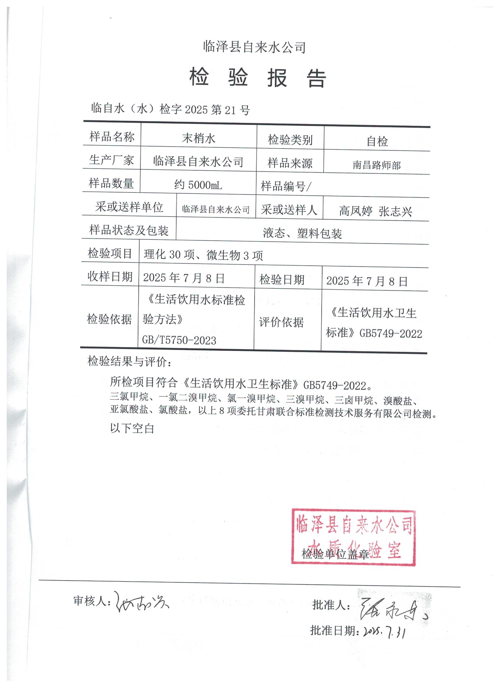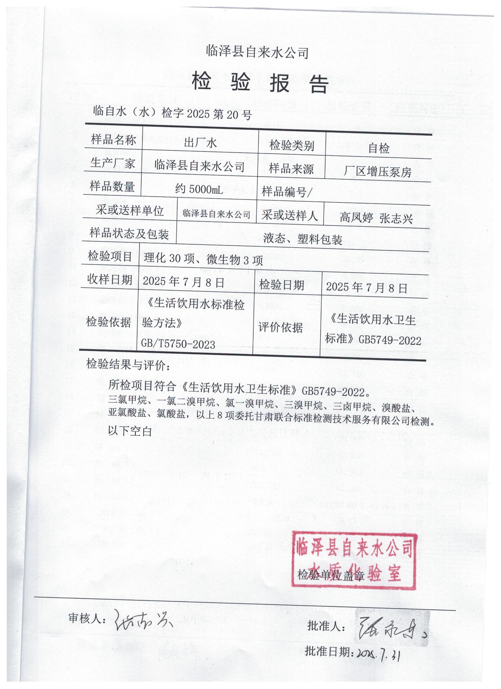 2025年7月临泽城市供水生活饮用水水质检测结果
