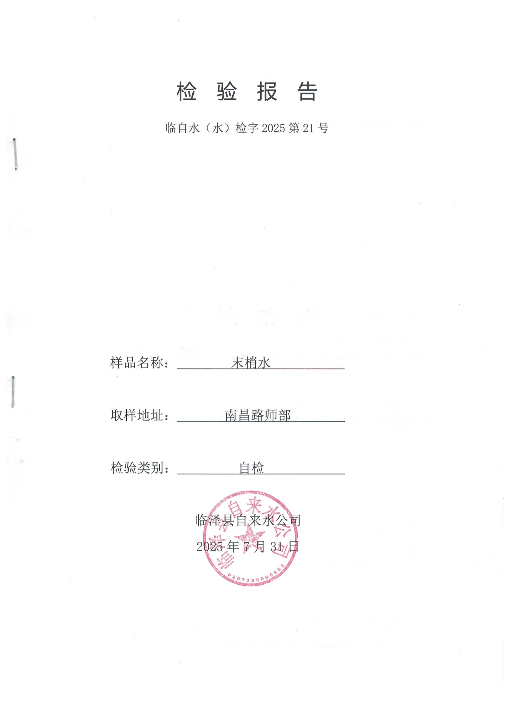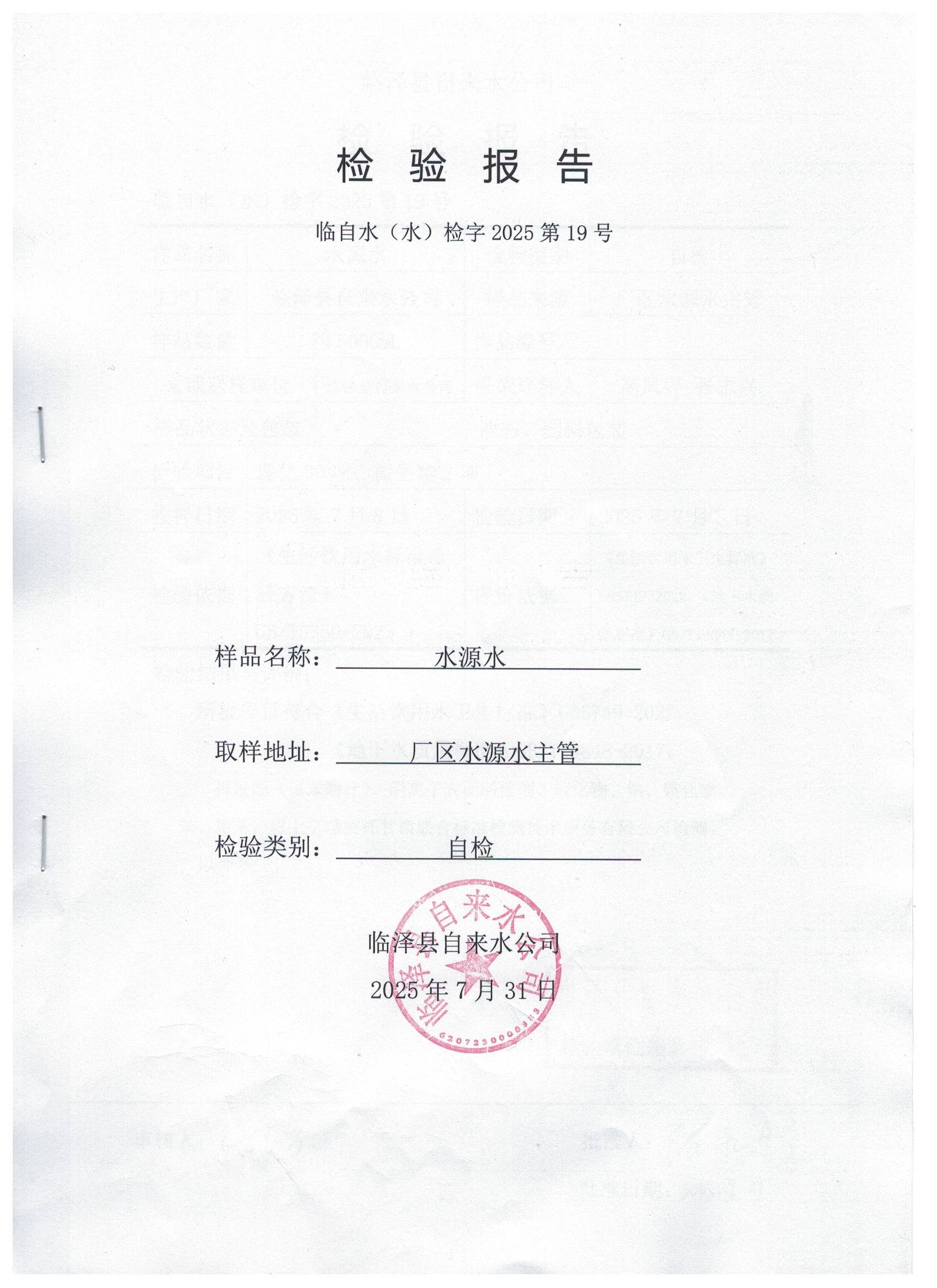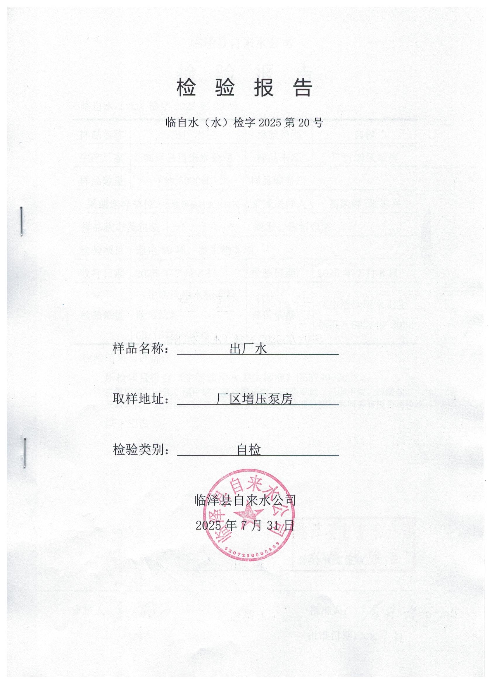 2025年7月临泽城市供水生活饮用水水质检测结果