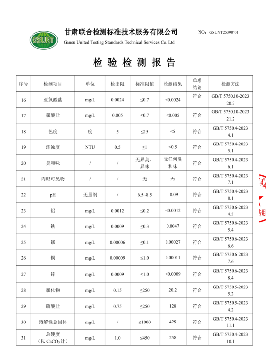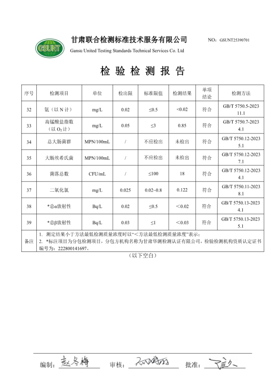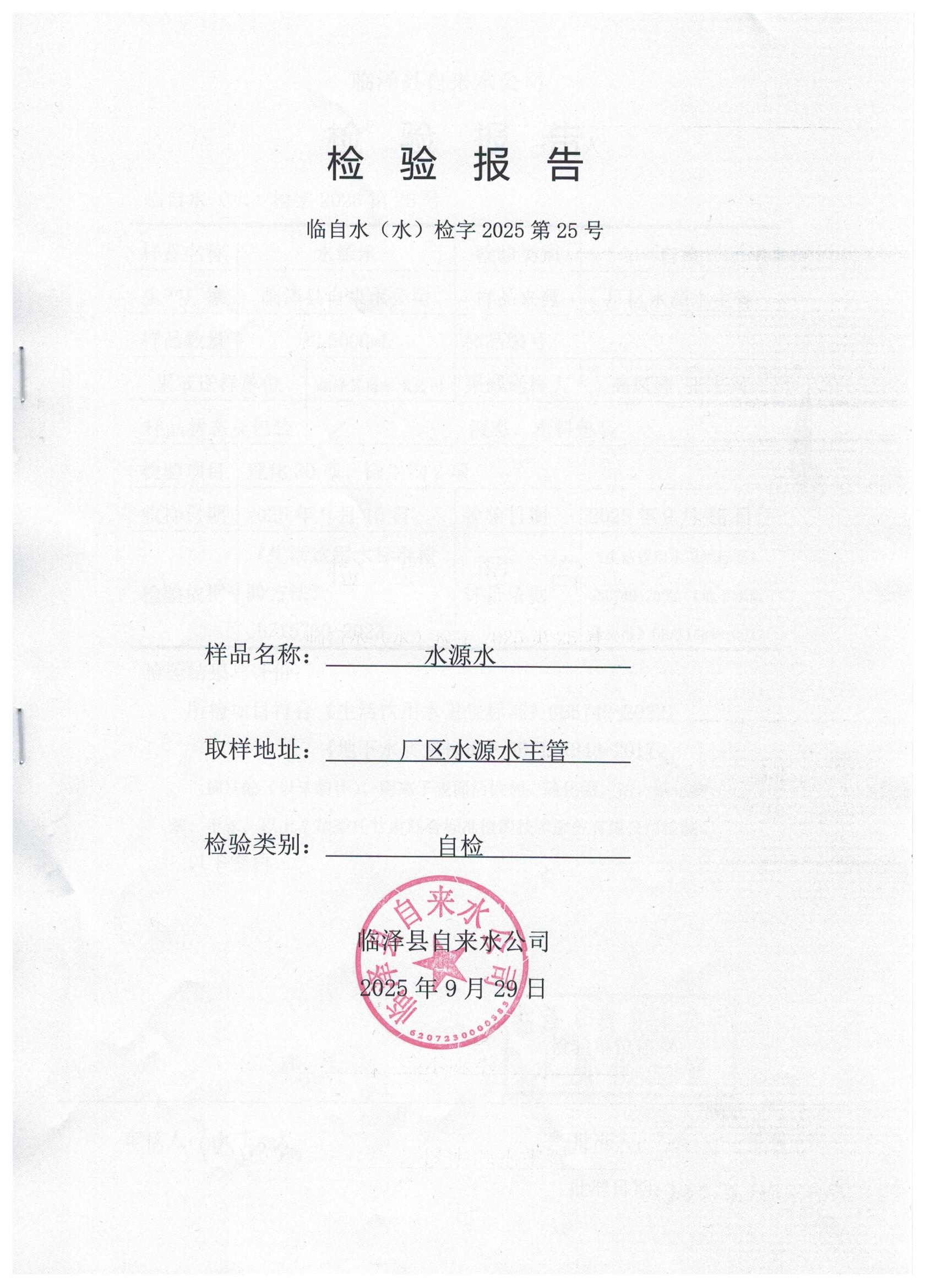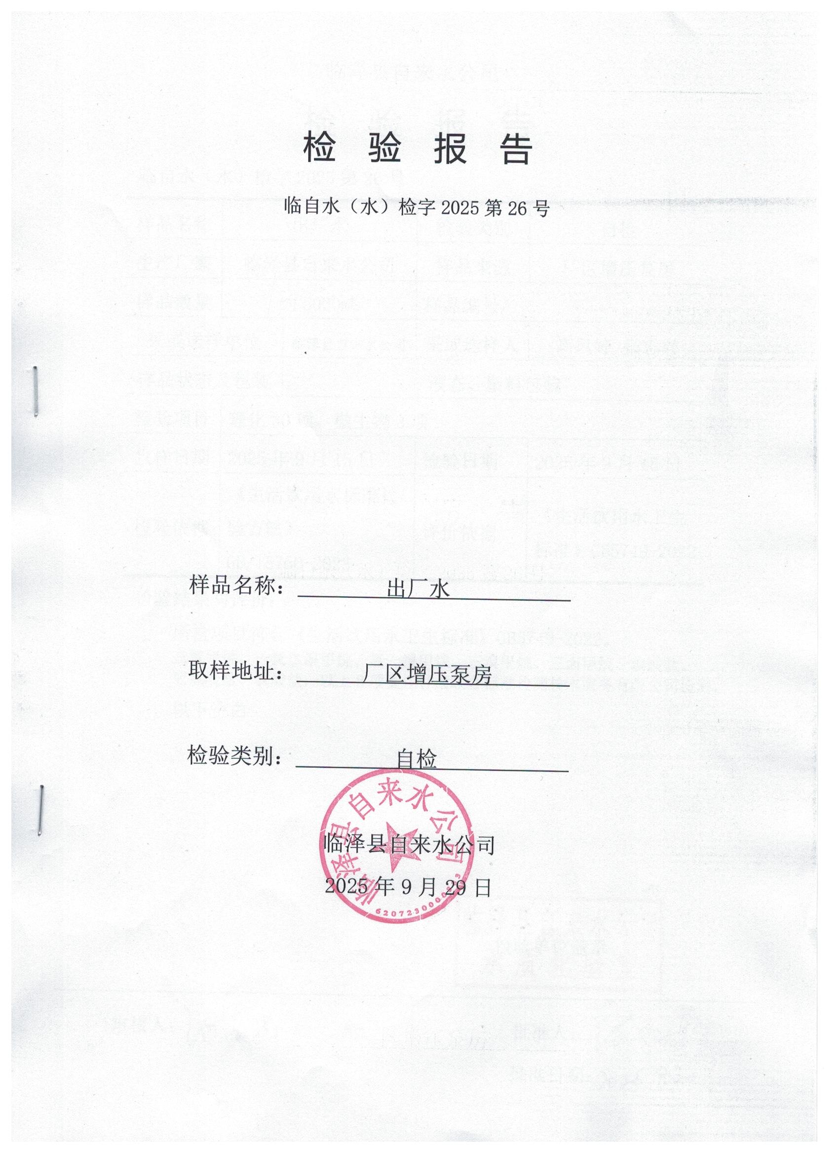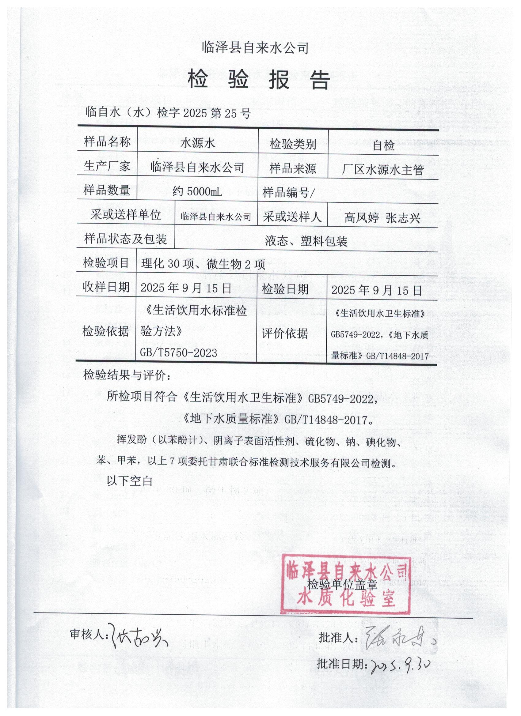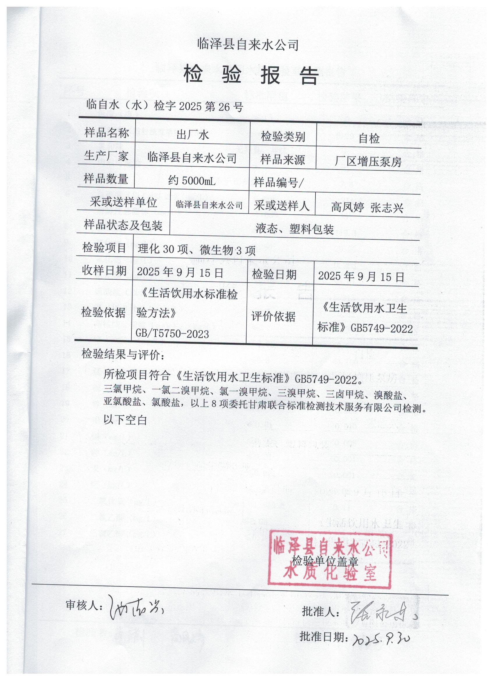 2025年9月临泽城市供水生活饮用水水质检测结果