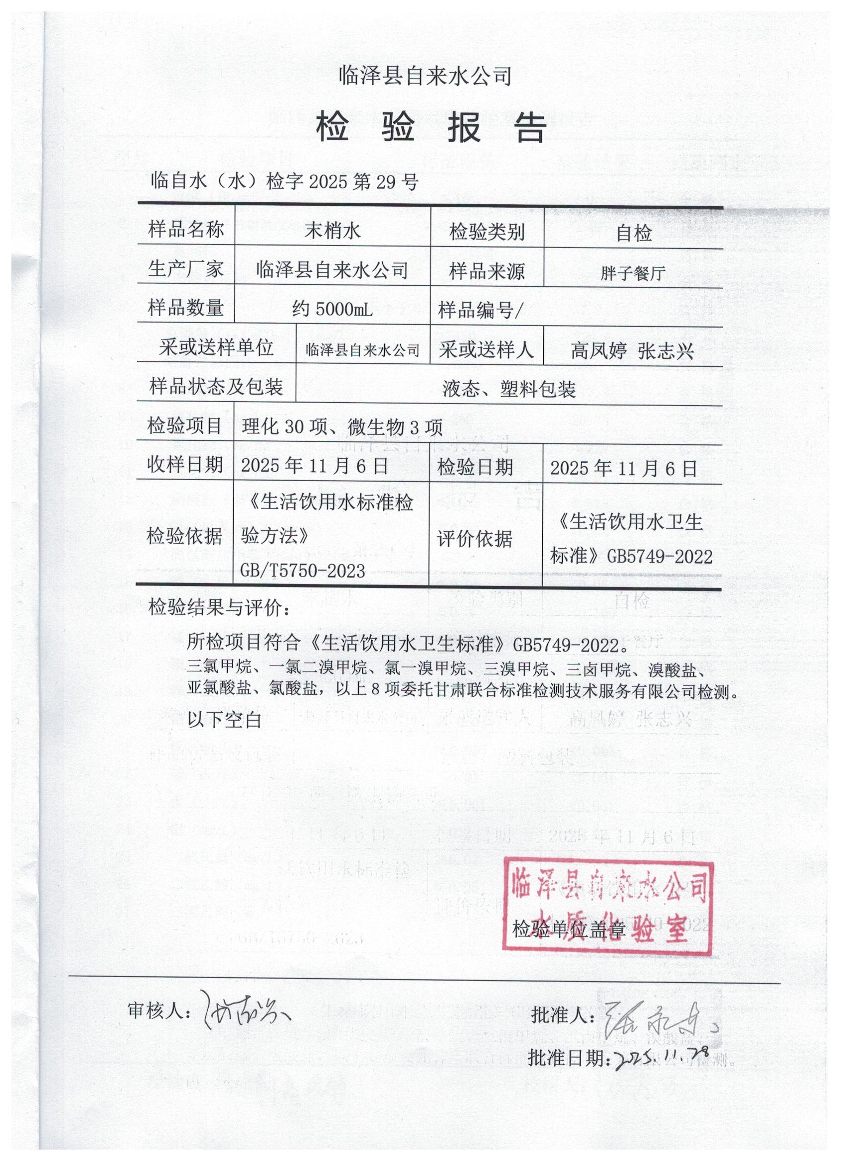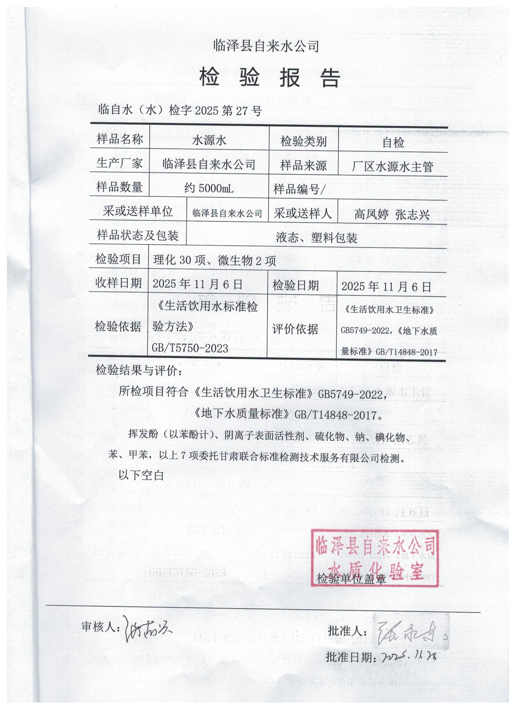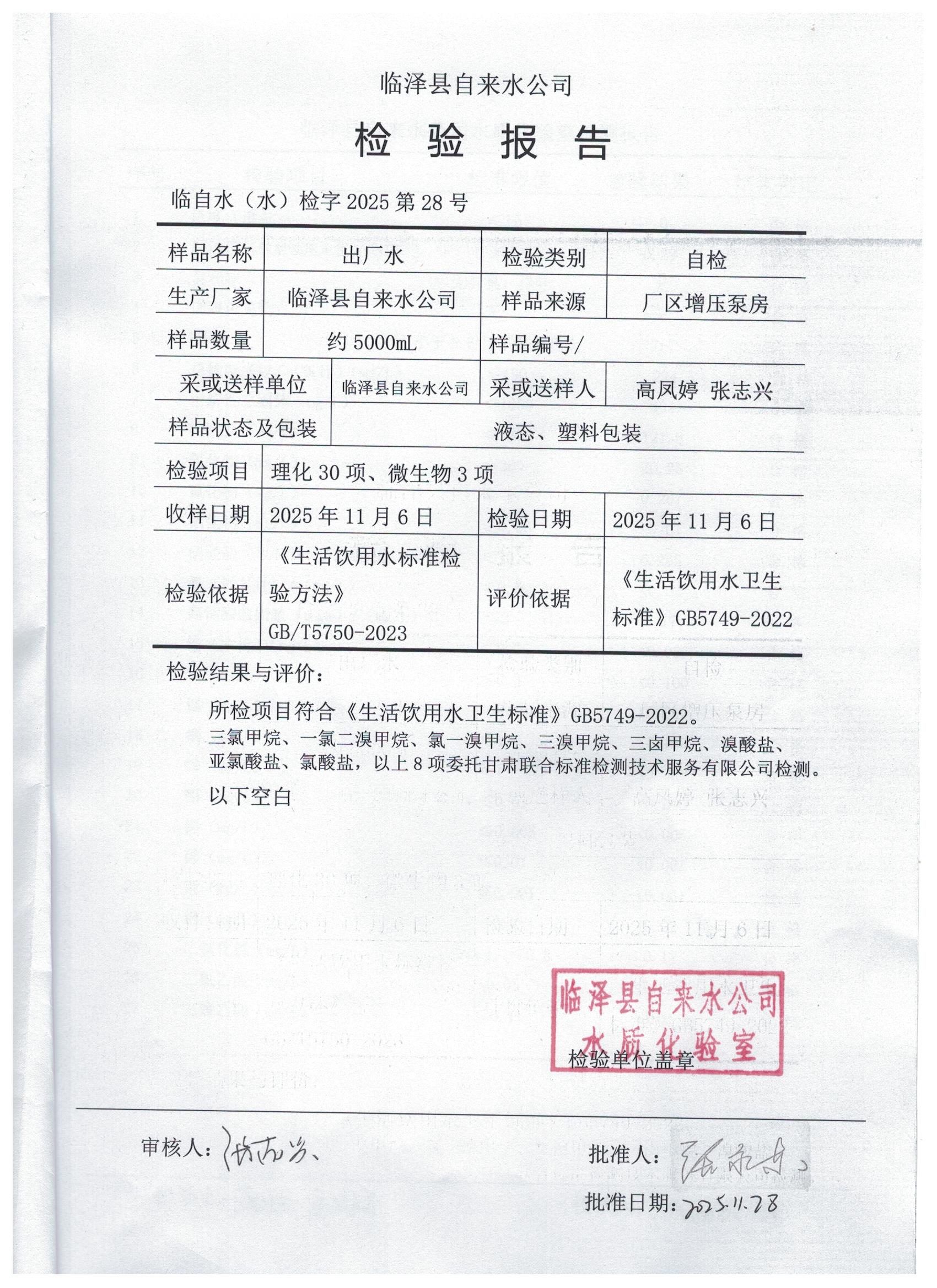 2025年11月临泽城市供水生活饮用水水质检测结果