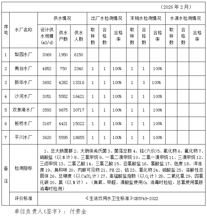 为掌握我县农村生活饮用水水质安全及卫生动态变化状况,依据《生活饮用水卫生标准》GB 5749-2022,我单位于2026年2月对6处农村饮水集中式供水工程,12个检测点的生活饮用水进行采样检测,检测结果接受社会各界和广大农村居民的监督,具体监测情况详见附表。