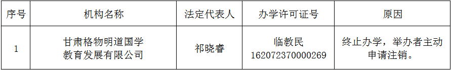 根据《中华人民共和国教育法》《中华人民共和国民办教育促进法》有关规定,甘肃格物明道国学教育发展有限公司举办者主动提出注销申请,经业务主管部门批准,予以注销,现公告如下:
