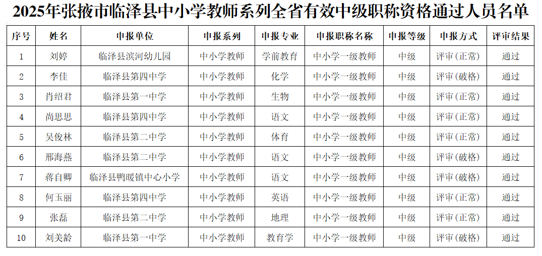 按照省人力资源和社会保障厅《关于进一步规范高中级专业技术职务评审公示工作的通知》(甘人职〔2016〕44号)要求,经张掖市临泽县中小学教师系列中级职称评审委员会2025年12月12日评审通过,刘婷等10名同志具备中小学教师系列全省有效中级职称资格。以上人员均在推荐上报前由用人单位进行了公示,现将评审结果予以公示(详见附件),接受广大专业技术人员与社会监督。