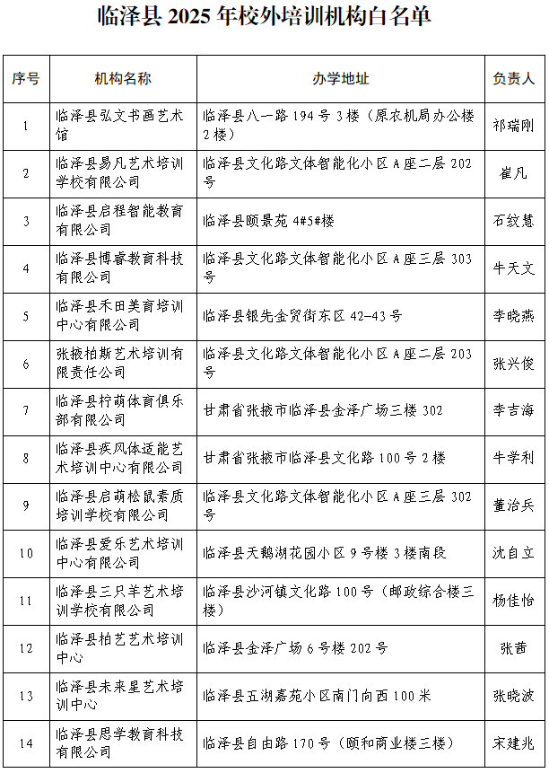 根据《中华人民共和国民办教育促进法》《国务院办公厅关于规范校外培训机构发展的意见》(国办发〔2018〕80号)和省、市相关文件精神,现将我县校外培训机构“白名单”公示如下。