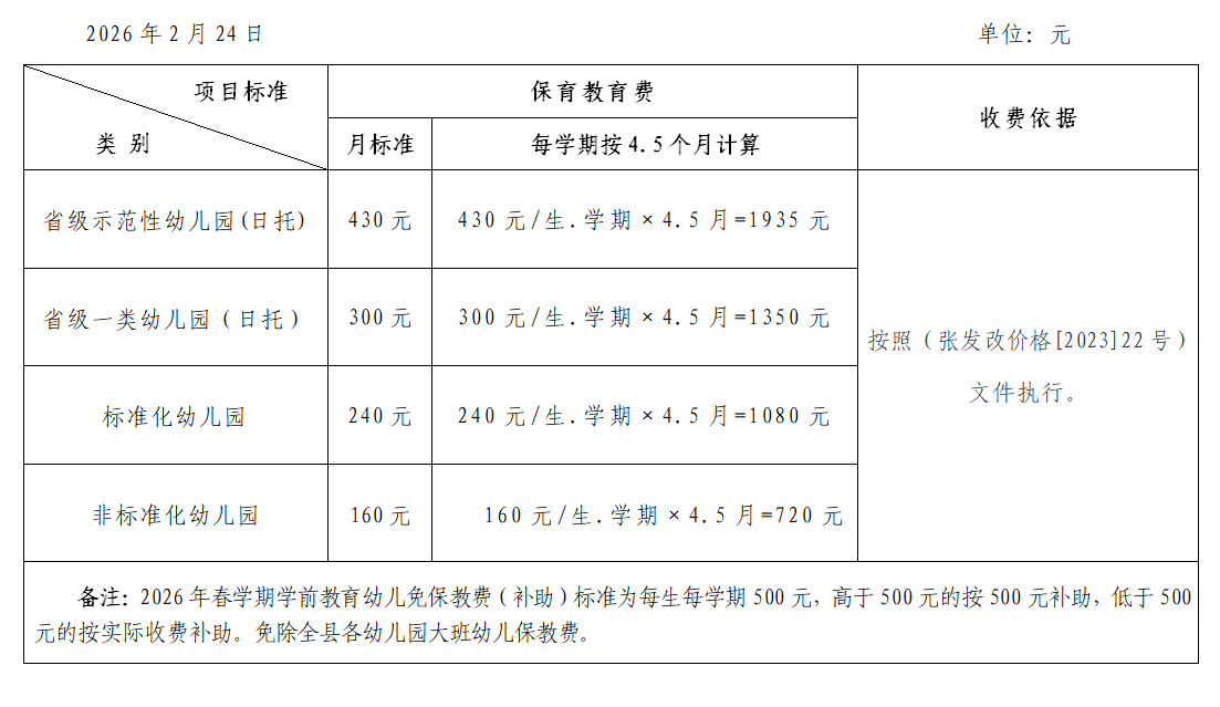 临泽县2026年春学期幼儿园保育教育费收费标准