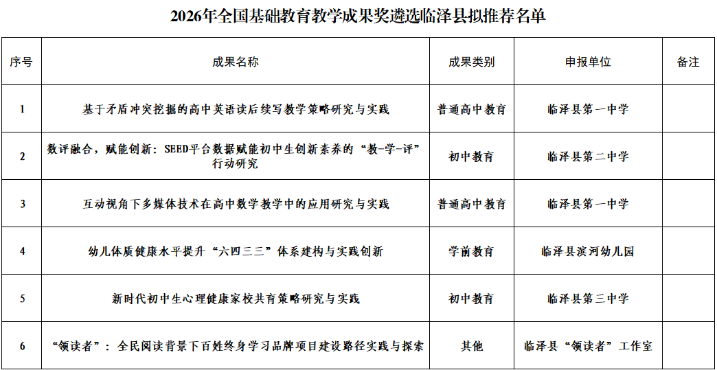 根据省教育厅《关于开展2026年国家级基础教育教学成果奖遴选工作的通知》和市教育局《关于组织参加2026年基础教育教学成果奖遴选工作的通知》要求,经教师申报,学校初评推荐,县教育局组织评审小组进行审核遴选,拟推荐以下6项教育教学成果参加市级遴选。现将县级遴选结果予以公示。接受社会各界监督。