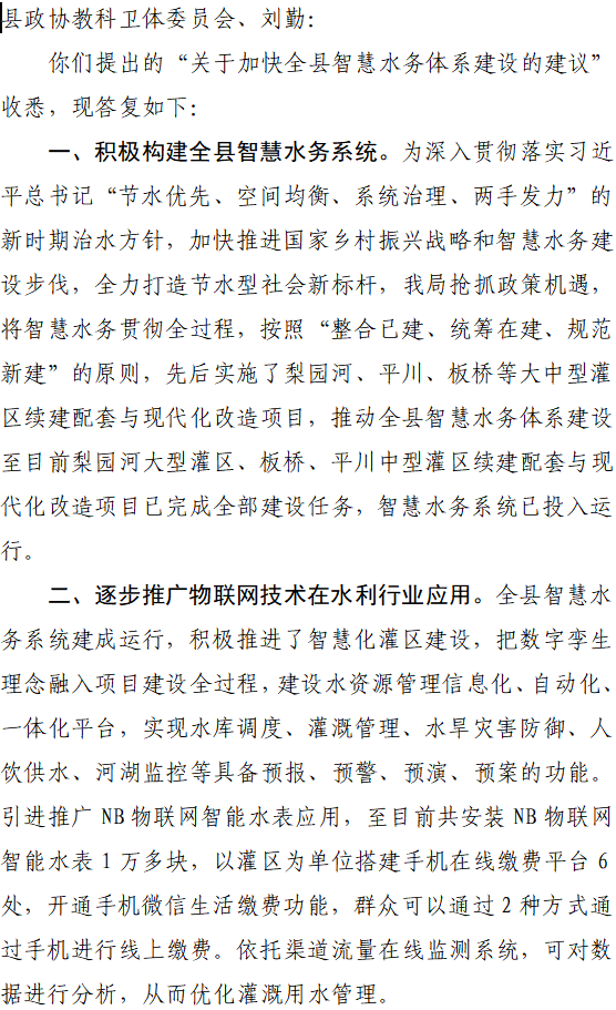 临泽县水务局关于对县政协十届四次会议期间第2号提案的答复