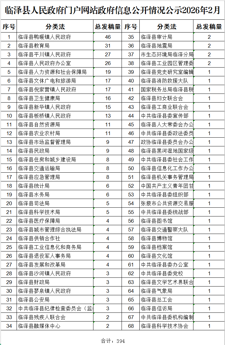 临泽县人民政府门户网站政府信息公开情况公示2026年2月