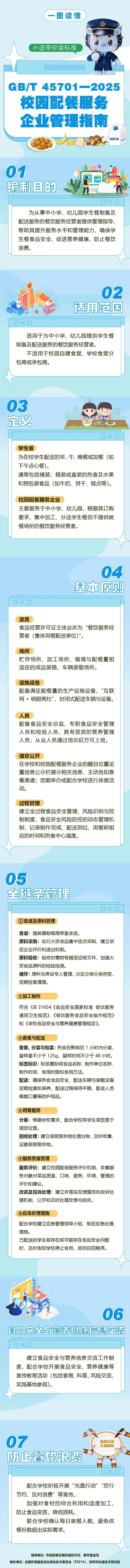 该标准适用于为中小学、幼儿园学生提供学生餐制作及配送服务的校园配餐服务企业,是校园配餐服务管理首个国家标准。标准明确了覆盖食谱及原料管理、加工制作、备餐与配送、用餐服务、服务评价改进、应急处理等全链条的规范指引,为校园配餐服务企业的合规管理提供标准化指导。同时,标准提出了有关食品安全与营养健康信息交流、防止餐饮浪费的操作指引,引导学生不断增强膳食平衡、节约环保理念,从小养成良好饮食习惯。