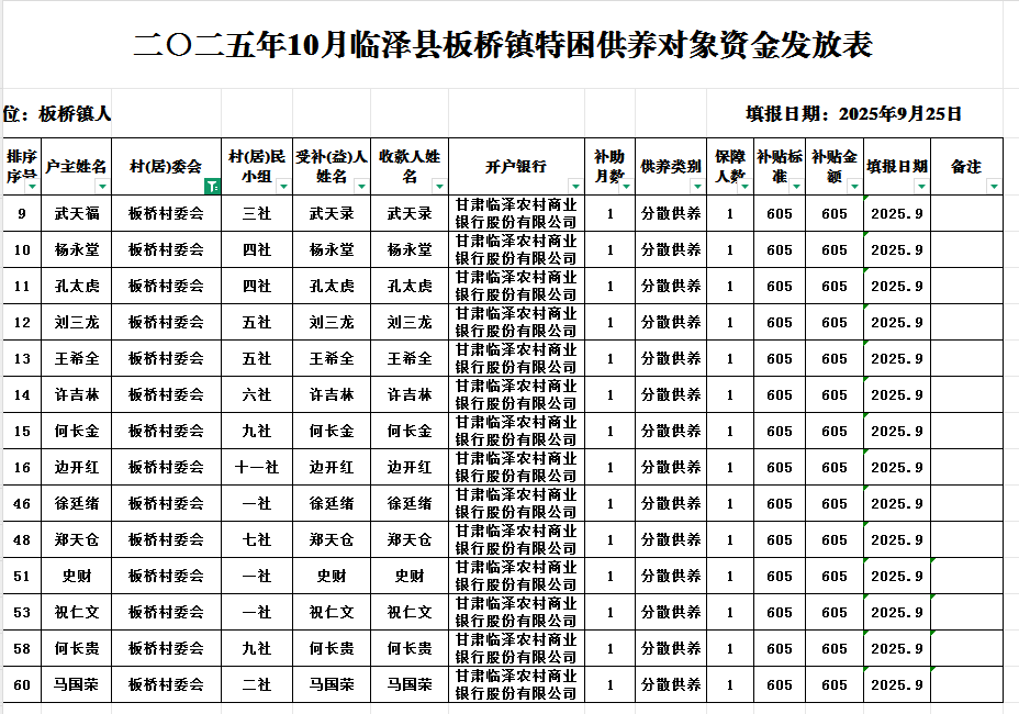 二〇二五年10月临泽县板桥镇板桥村特困供养对象资金发放表