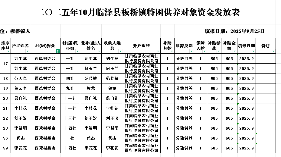 二〇二五年10月临泽县板桥镇西湾村特困供养对象资金发放表