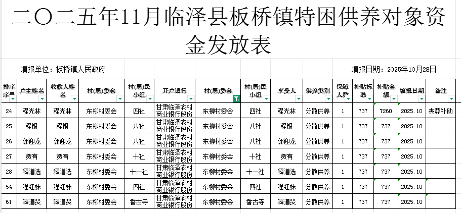 二〇二五年11月临泽县板桥镇东柳村特困供养对象资金发放表