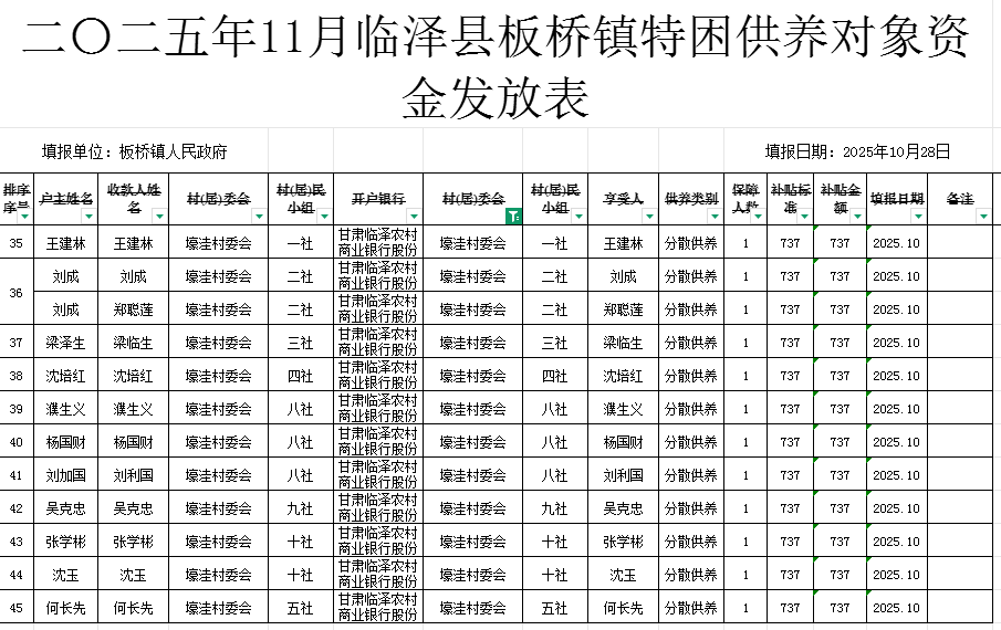 二〇二五年11月临泽县板桥镇壕洼村特困供养对象资金发放表
