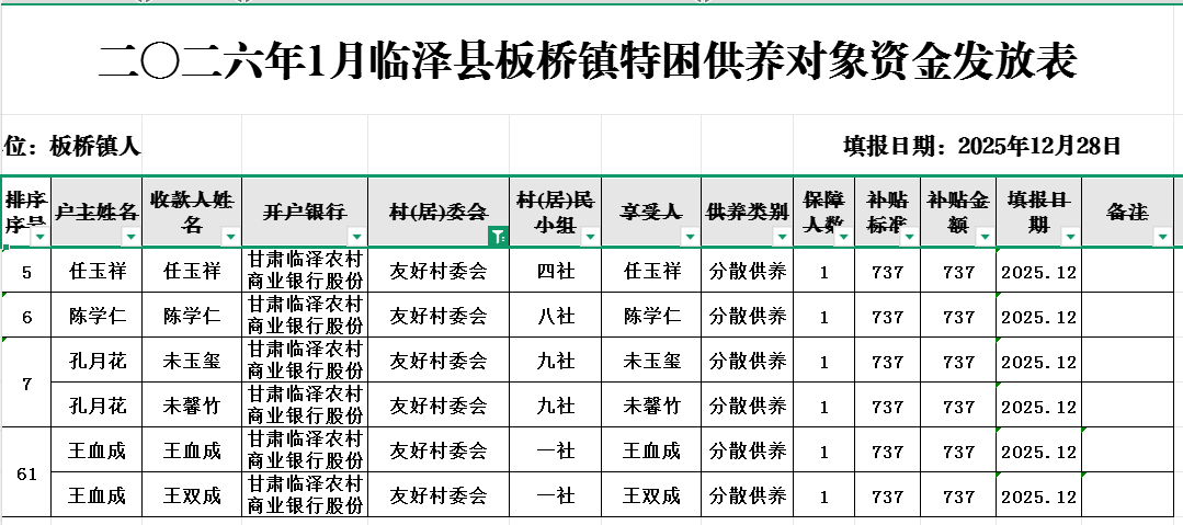 二〇二六年1月临泽县板桥镇友好村特困供养对象资金发放表