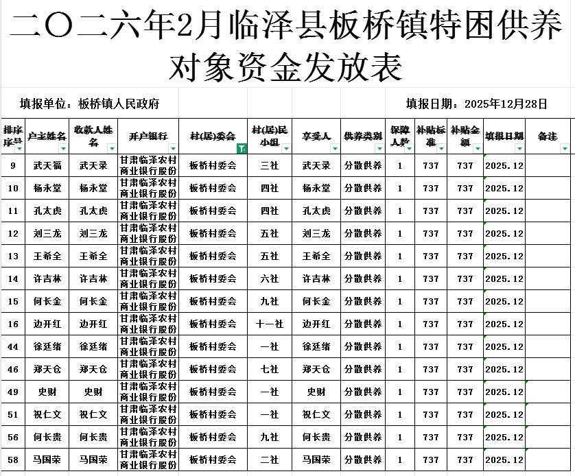 二〇二六年2月临泽县板桥镇板桥村特困供养对象资金发放表