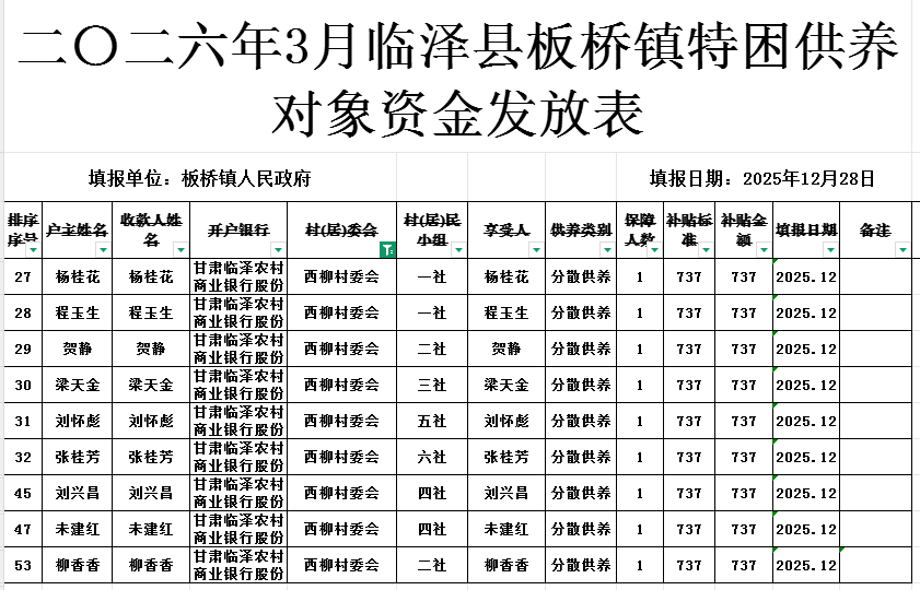 二〇二六年3月临泽县板桥镇西柳村特困供养对象资金发放表