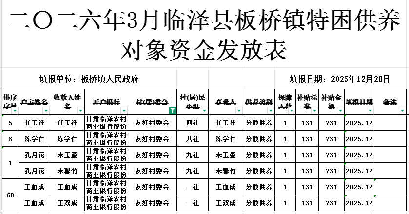 二〇二六年3月临泽县板桥镇友好村特困供养对象资金发放表