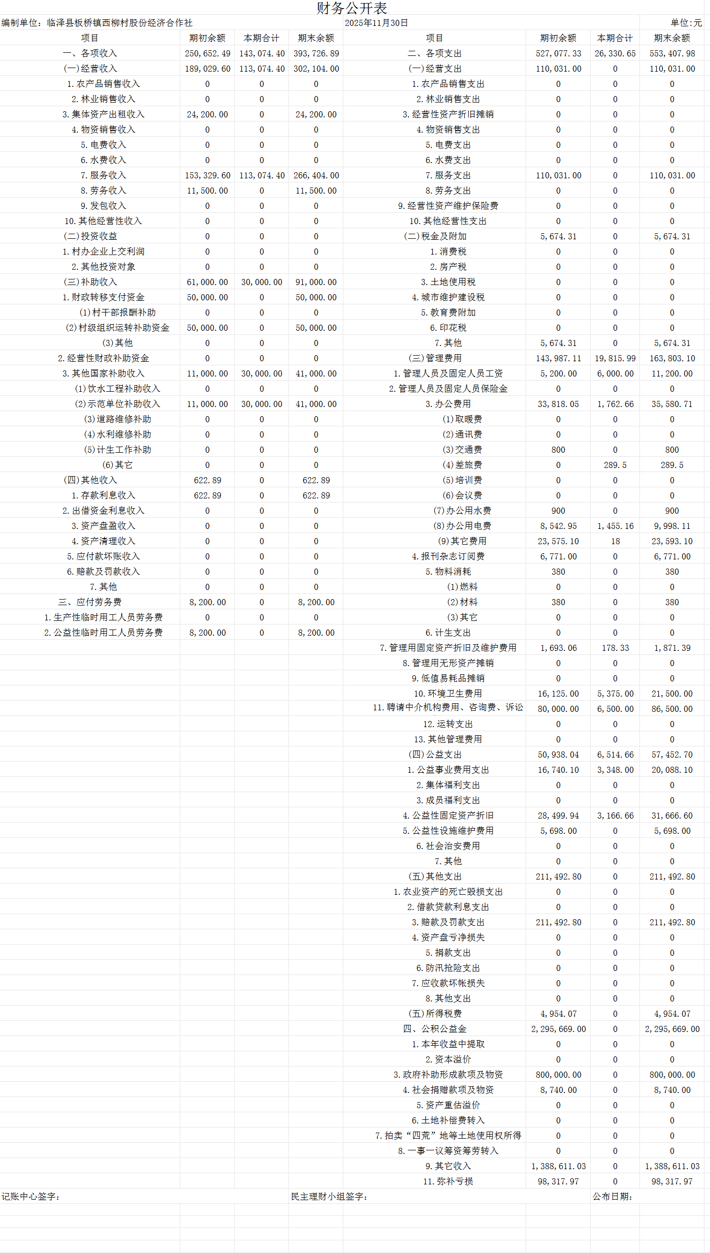 临泽县板桥镇西柳村2025年11月财务公开表
