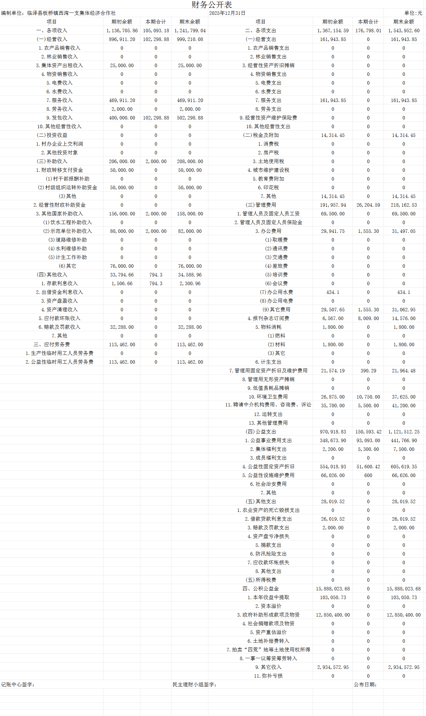 临泽县板桥镇西湾一支2025年12月财务公开表