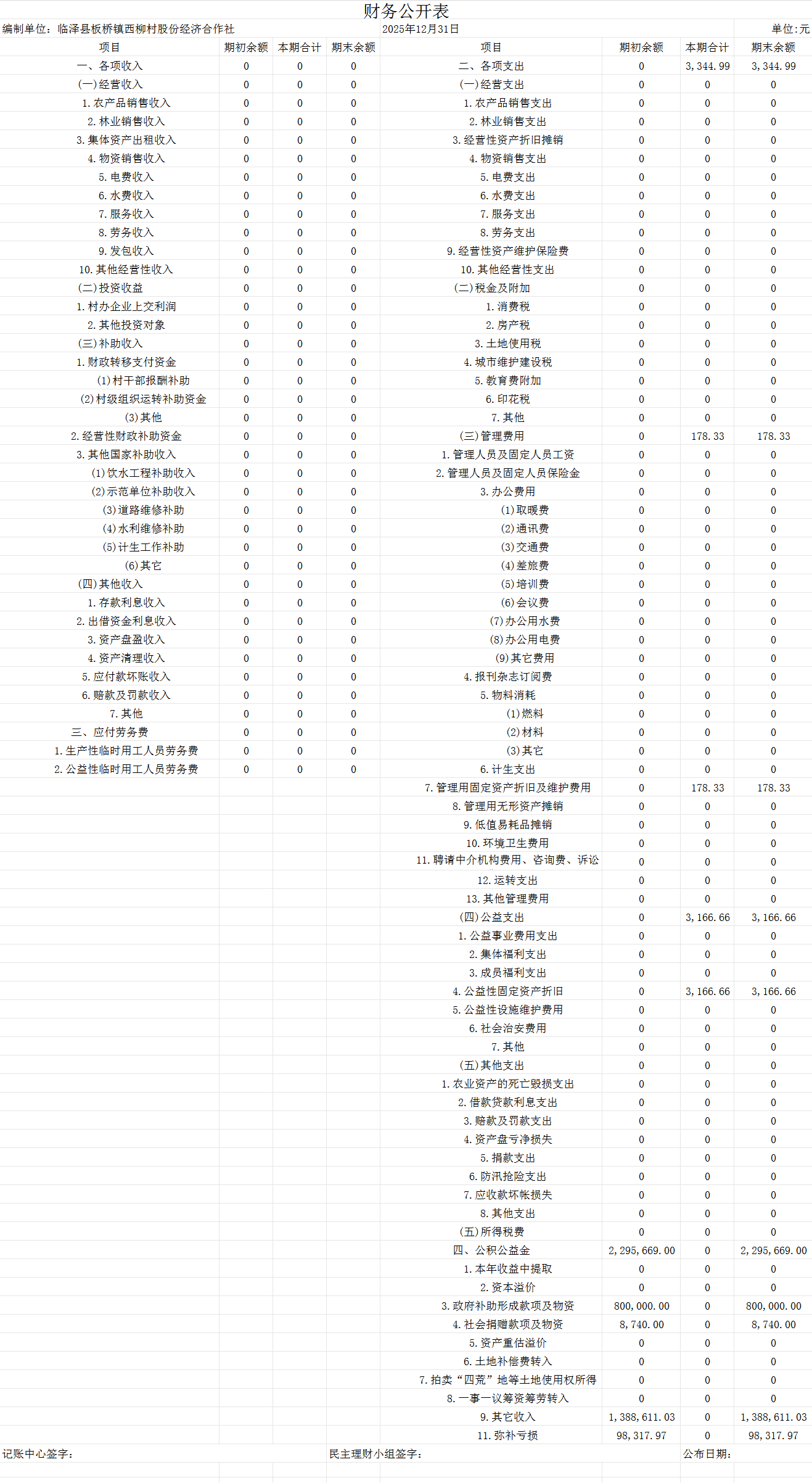 临泽县板桥镇西柳村2025年12月财务公开表