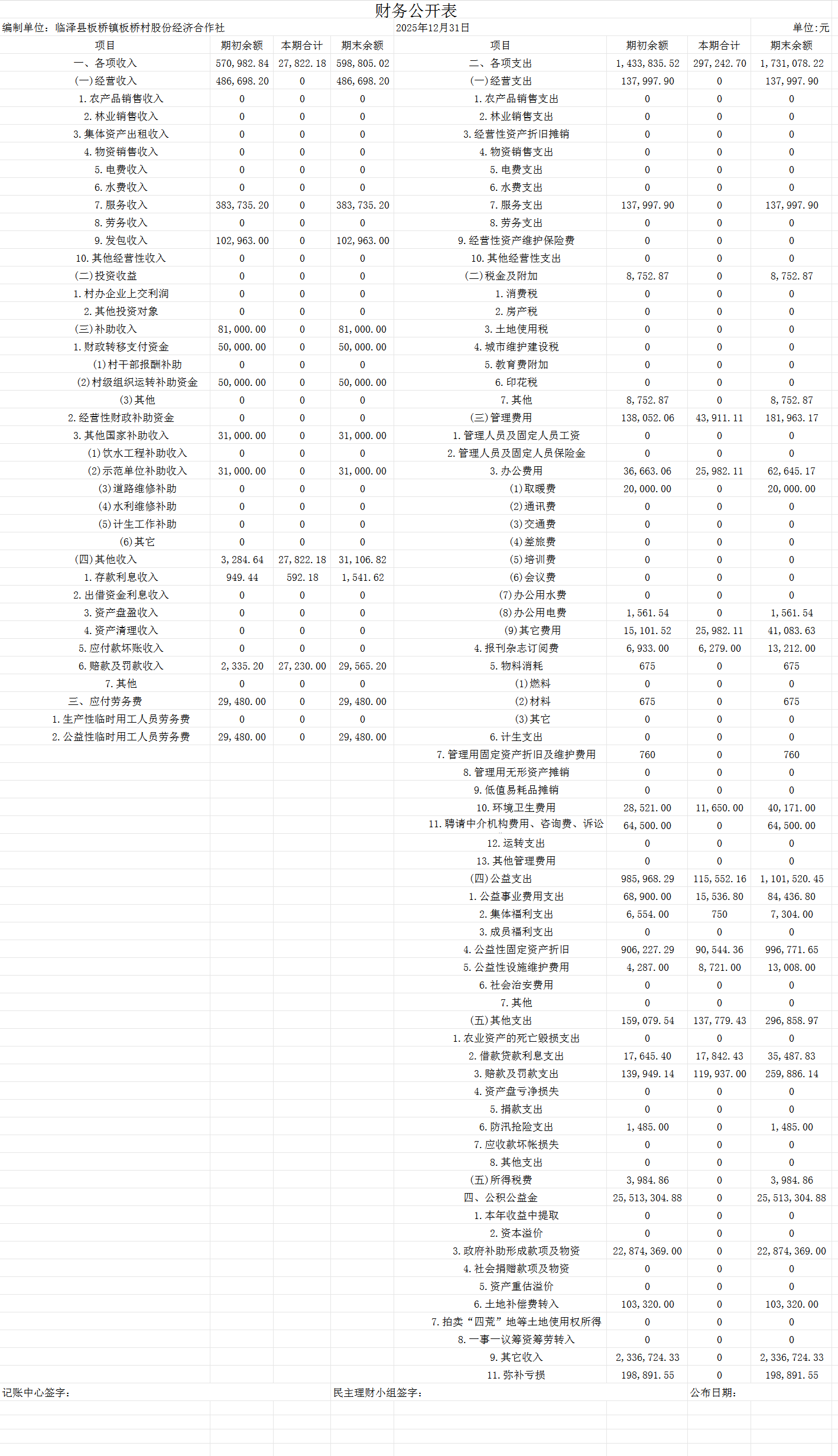 临泽县板桥镇板桥村2025年12月财务公开表