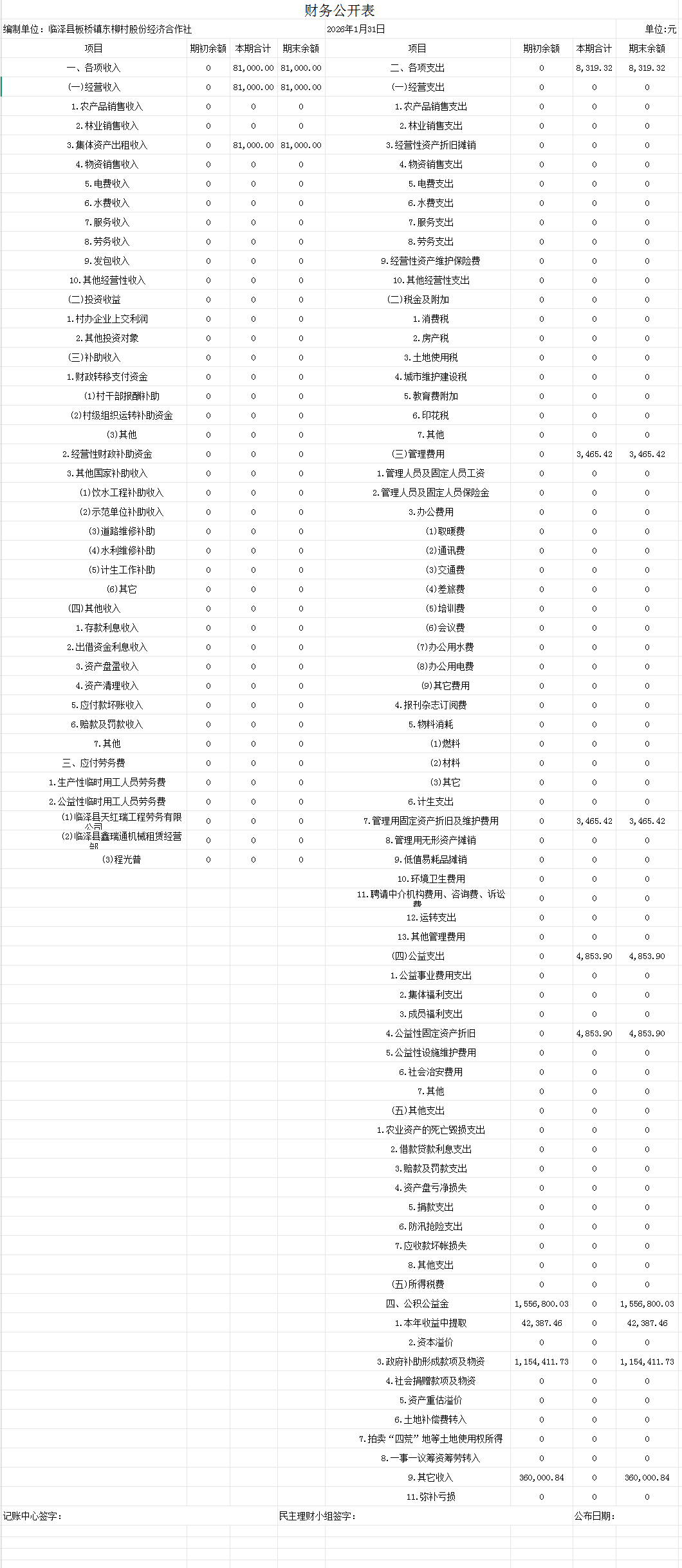 临泽县板桥镇东柳村2026年1月财务公开表