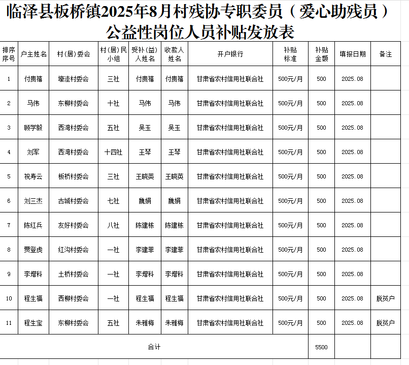 临泽县板桥镇2025年8月村残协专职委员(爱心助残员)公益性岗位人员补贴发放表