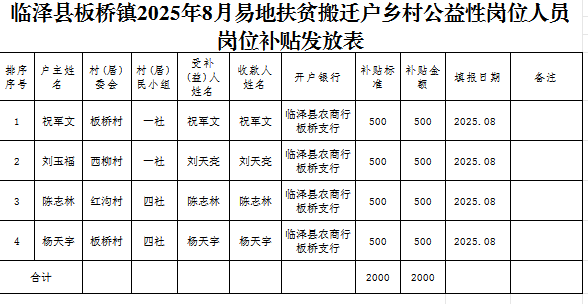 临泽县板桥镇2025年8月易地扶贫搬迁户乡村公益性岗位人员岗位补贴发放表