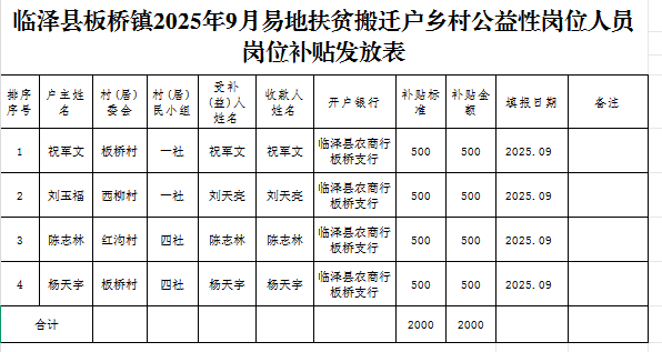 临泽县板桥镇2025年9月易地扶贫搬迁户乡村公益性岗位人员岗位补贴发放表