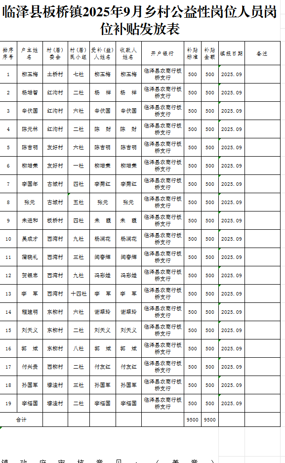 临泽县板桥镇2025年9月乡村公益性岗位人员岗位补贴发放表