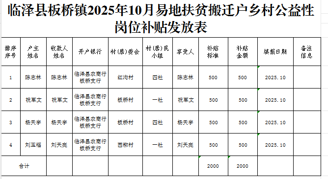 临泽县板桥镇2025年10月易地扶贫搬迁户乡村公益性岗位补贴发放表