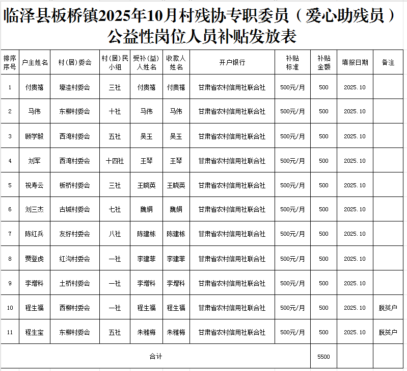 临泽县板桥镇2025年10月村残协专职委员(爱心助残员)公益性岗位人员补贴发放表