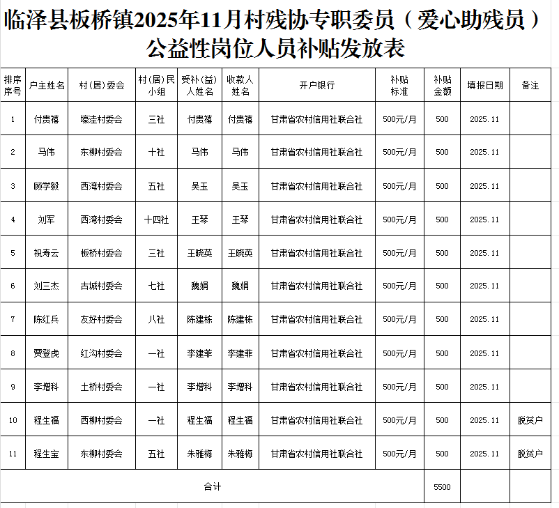 临泽县板桥镇2025年11月村残协专职委员(爱心助残员)公益性岗位人员补贴发放表