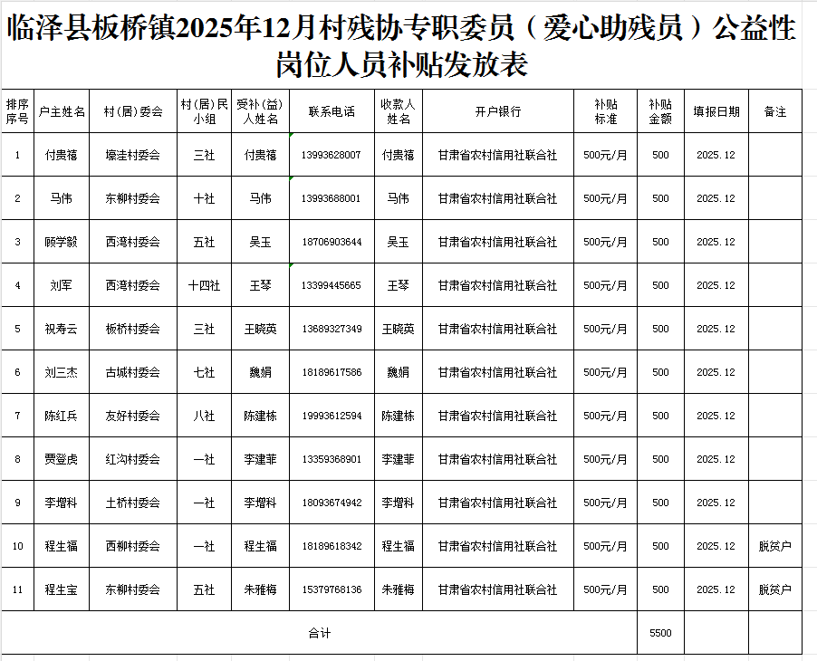临泽县板桥镇2025年12月村残协专职委员(爱心助残员)公益性岗位人员补贴发放表