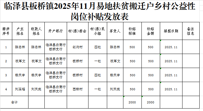临泽县板桥镇2025年11月易地扶贫搬迁户乡村公益性岗位补贴发放表