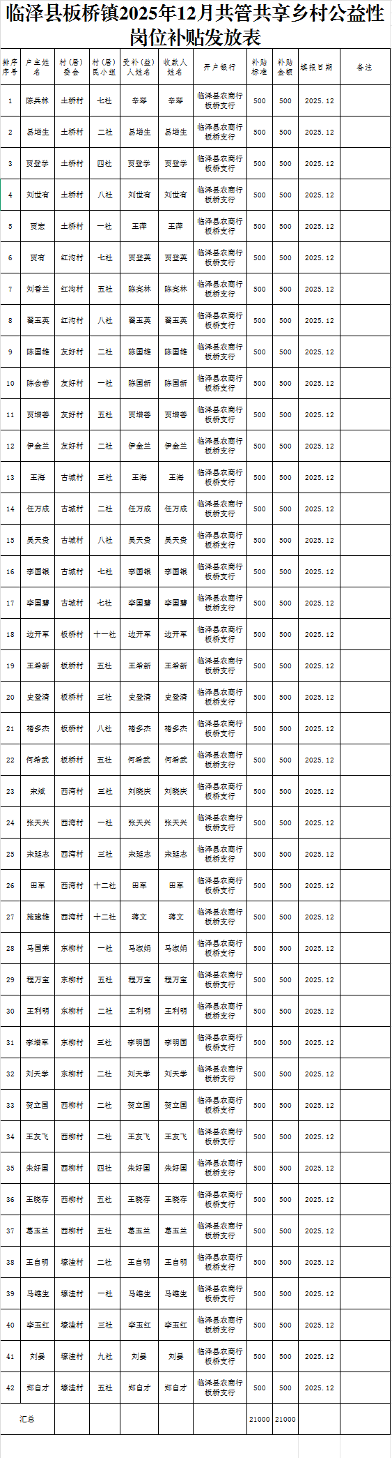 临泽县板桥镇2025年12月共管共享乡村公益性岗位补贴发放表