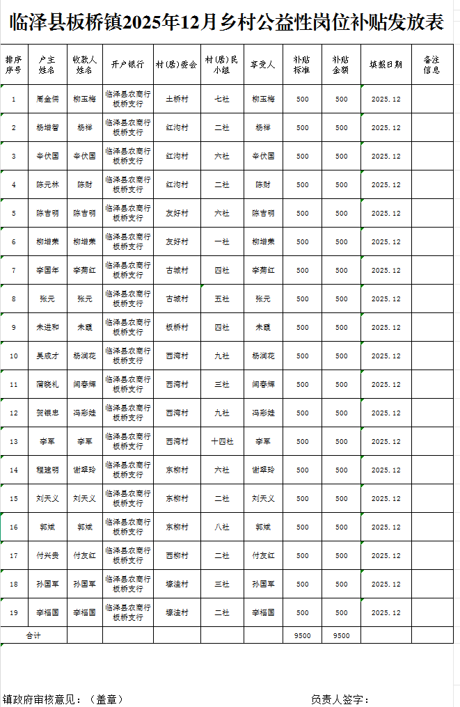 临泽县板桥镇2025年12月乡村公益性岗位补贴发放表